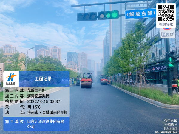 10月15日,濟南市中央商務區(qū)瀝青面層一期——茂嶺二號路快車道瀝青開始施工。茂嶺二號路全長1446米,分為東西兩半幅,半幅寬度9.25米,此次攤鋪作業(yè)面積約3.4萬平方,計劃SMA-13瀝青馬蹄脂碎混合料用量3264噸,現場機械使用4臺攤鋪機,4臺大壓路機,3臺小壓路機聯合作業(yè)。