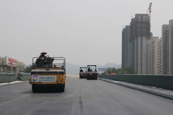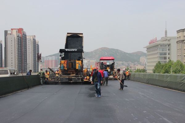 5月8日上午,二環南(西段)四標進行橋面防水瀝青施工試驗段攤鋪。此次試驗段長260米、寬11.75米,面積3055平方,防水找平層瀝青砂厚2厘米。