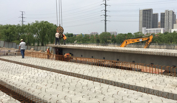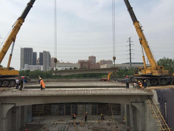 5月18日上午9時,濱河南路拓寬改造工程第一塊T型板梁正式開始吊裝。該橋設計寬26米,橋跨18米,橋型為一跨簡支變截面肋梁橋,主梁采用裝配式后張預應力混凝土變截面T梁,吊裝后濕接。經過連續不間斷作業,于下午16時圓滿完成七塊主梁、兩塊邊梁,共計九塊板梁的吊裝任務,比原計劃提前一天,至此標志著橋梁主體結構工程順利完成。