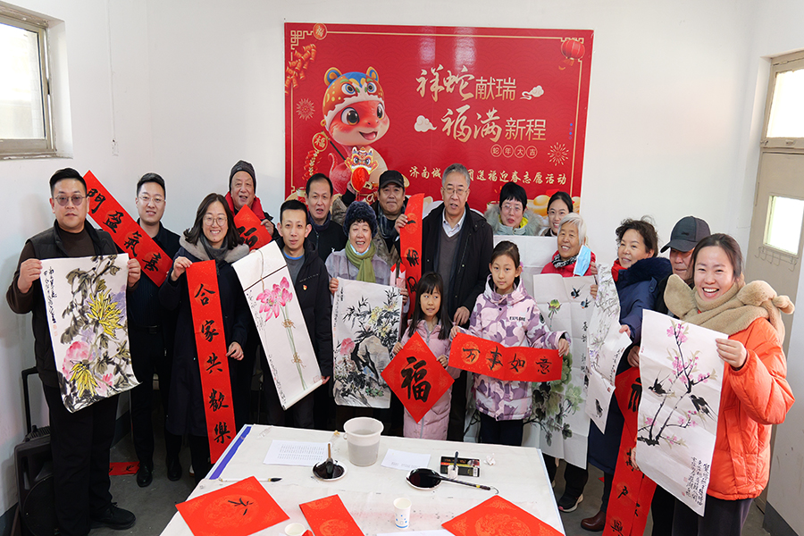 為深入貫徹中央社會(huì)工作會(huì)議精神,弘揚(yáng)傳統(tǒng)文化,豐富社區(qū)生活,1月10日,匯通集團(tuán)第一支部聯(lián)合濟(jì)南市文聯(lián)、濟(jì)南市美協(xié)共同走進(jìn)千佛山西路社區(qū)、歷園新村社區(qū)開展“迎新送福”文藝惠民服務(wù)活動(dòng)。 活動(dòng)中,濟(jì)南市文聯(lián)副主席、濟(jì)南市美協(xié)主席李慶杰,山東省文聯(lián)委員、濟(jì)南市美協(xié)副主席兼秘書長(zhǎng)張春艷,濟(jì)南市美協(xié)副主席張波、吳疆、李軍,濟(jì)南市書協(xié)副秘書長(zhǎng)任清,青年作者楊淑涵、王文秀等書畫家現(xiàn)場(chǎng)揮毫潑墨,為社區(qū)群眾書寫春聯(lián)、福字,并捐贈(zèng)寓意美好的書畫佳作,以筆墨為媒,將新春的祝福與溫暖傳遞給每一位社區(qū)群眾。 居民們手捧著火紅的春聯(lián),心中滿載著“?!睔?,臉上洋溢著幸福的笑容,一幕幕歲月靜好在這個(gè)瞬間凝結(jié)成時(shí)光印記,溫暖