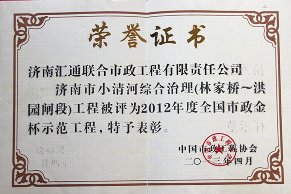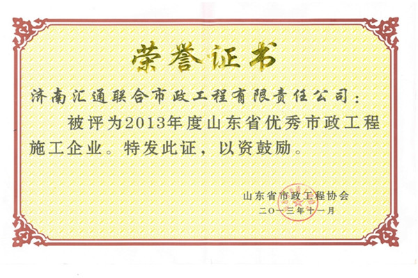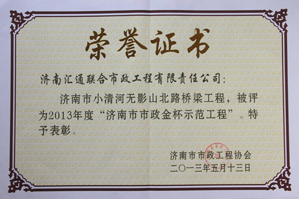 公司近年來先后承建了濟南經十路道路及環境建設工程、濟南市興濟河截污工程、濟南市北園高架橋工程、濟南市奧體中心市政工程、濟南市二環東路及BRT系統建設工程、蕪湖市赭山路改造工程、濟南市西區大學路工程、大明湖路改造工程、小清河綜合整治工程、濟南市文化路道路改造工程、濟南市西客站片區市政工程、濟南市二環西路、二環南路改造工程、濟南市工業北路快速路建設工程、北園大街快速路西延建設工程、淄博市正陽路南延工程、南通東快速路工程、連云港珠江路高架橋梁(鐵路跨線橋梁)工程、藍翔路藍翔中路道路改造工程、順河南延玉函路隧道工程、順河南延103隧道工程、220國道長清段改擴建工程等一大批省市重點工程,多項工程榮獲“國家優質工程獎”、“全國市政金杯示范工程”和“山東省建筑質量泰山杯工程”、“山東省市政金杯示范工程”等榮譽稱號,其中濟南市經十路道路及環境建設工程榮獲國家建設工程質量最高獎——魯班獎。江蘇省南通市東快速路建設工程、山東省濟南市二環南路建設工程榮獲國家優質工程獎。施工質量及現場安全文明、環保及工期進度均得到各級領導、建設單位及社會周邊相關單位一致好評,取得了較好的社會效益和經濟效益,社會美譽度逐年提升,被授予“山東省優秀市政工程施工企業”。