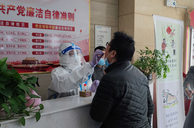 自11月30日起,隨著解除封控回到基地上班的職工陸續(xù)增加,有職工提到自己居住地核酸檢測時間結(jié)束的早,很怕耽誤了檢測,無法按時上班。分公司后勤保障組組長馬婕立刻多方打聽,詳細詢問,反復(fù)溝通,終于得到華山街道辦事處的回復(fù),可以上門對核酸檢測進行培訓和指導(dǎo)。很快,由小組成員李小嬌、張文鳳和物業(yè)公司工作人員組成的臨時核酸檢測點籌備完成。